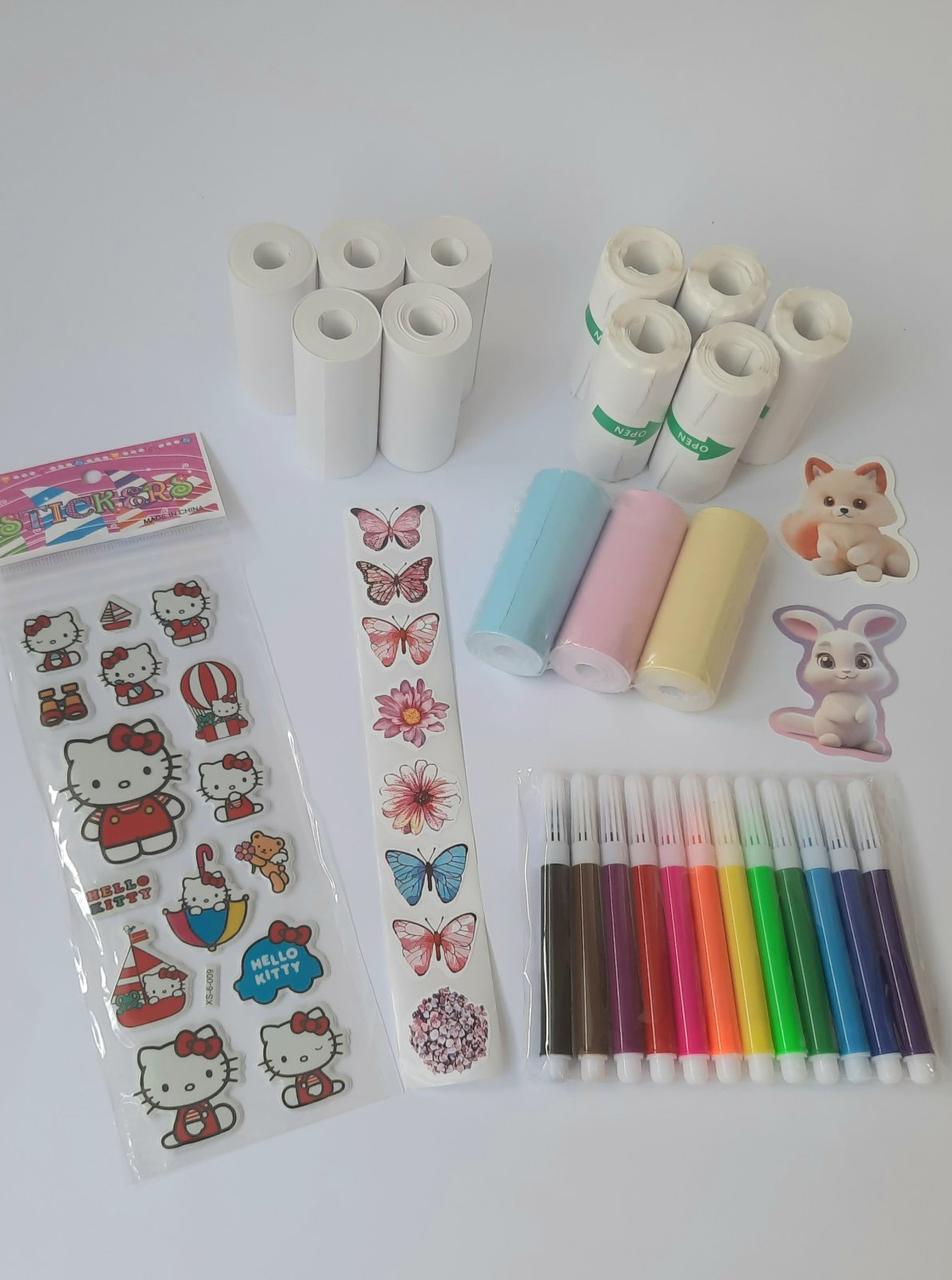Термопапір для дитячих фотоапарата та міні-принтера, в комплекті 13 шт рулонів простих та клейчастих з фломастерами та наклейка у подарунок
